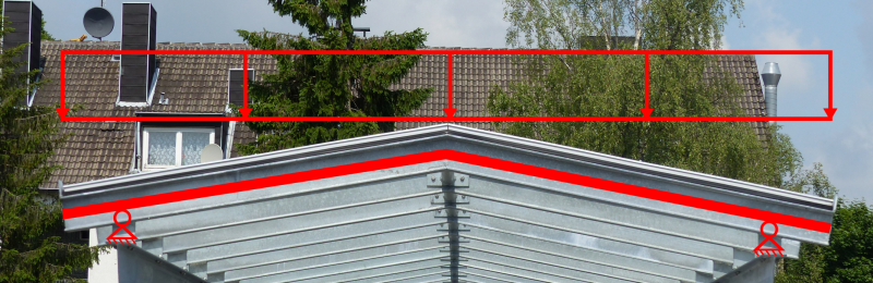 Vertikale Belastungen wie Eigengewicht und Schneelasten werden von den Dachträgern in die Durchlaufträger geleitet, welche die Lasten der Dachträger in die Stützen leiten. Von den Stützen werden die Kräfte anschließend in den Untergrund geleitet. Da die Stützen rein gelenkig gelagert sind, kann eine gegenseitige Verschiebung der Stahlträger durch Horizontallasten, wie beispielsweise Windlasten, nicht verhindert werden. Die Zugbänder dienen dazu, die horizontalen Kräfte aufzunehmen und auf die Stützen umzuleiten. Es sind jeweils zwei entgegengesetzte Zugdiagonalen angeordnet, die je nach Richtung der Lasten auf Zug beansprucht werden.